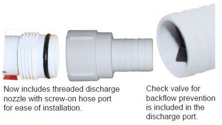 - Backflow prevention - now includes a check valve in the discharge port which reduces the amount of water draining back from the pump discharge hose into the bilge
